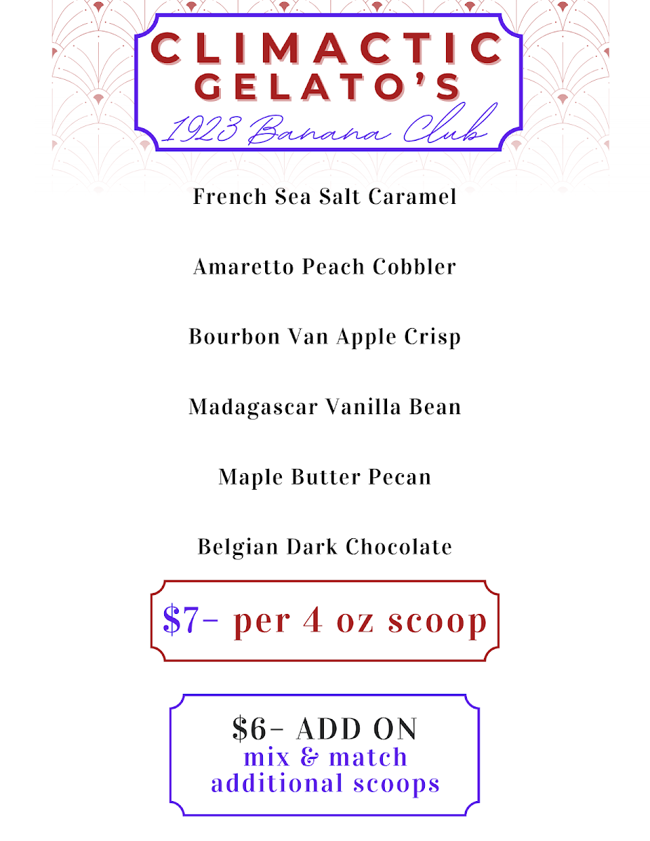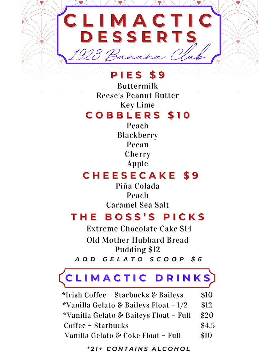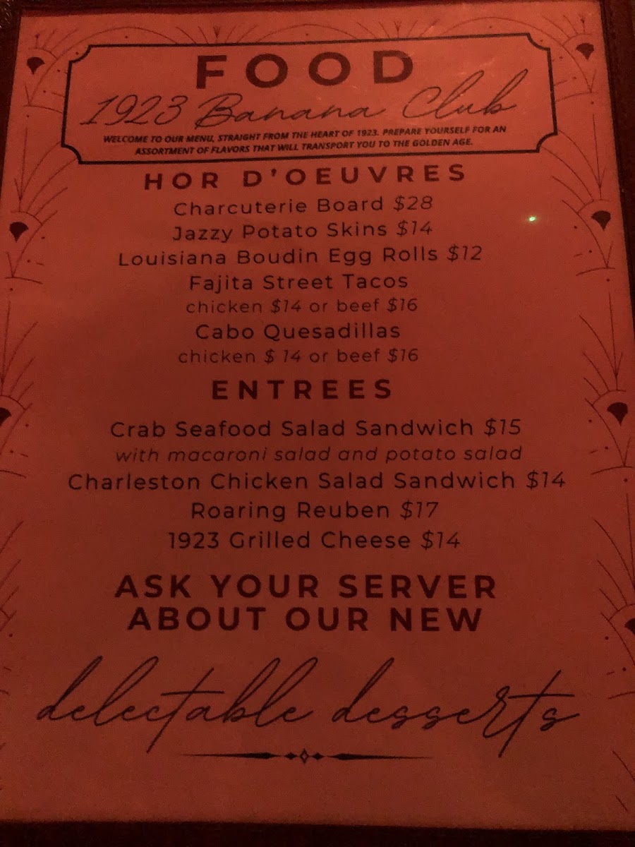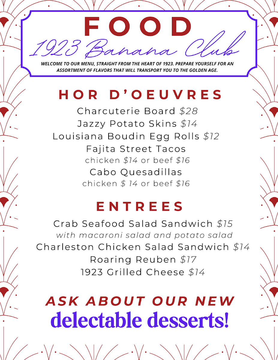 The menu at 1923 Banana Club offers a delightful variety of dishes, each with a unique twist. For starters, the Gatsby Charcuterie Board and Jazzy Potato Skins set the tone for a flavorful experience. For something more adventurous, the Louisiana Boudin Egg Rolls and Speakeasy Fajita Street Tacos are perfect choices. The Cabo Quesadillas provide a delicious fusion of ingredients, while the Charleston Chicken Salad Sandwich and Crab Seafood Salad Sandwich offer fresh and satisfying options for sandwich lovers. For those craving a hearty meal, the Roaring Reuben and 1923 Grilled Cheese are standouts. As for dessert, the Big Boss Bread Pudding and Corinne's Key Lime Pie are must-try sweet treats, with the Over-the-Top Chocolate Ganache Cake and Chocolate Peanut Butter Landslide Cake providing indulgent options for chocolate lovers. The menu at 1923 Banana Club beautifully blends comfort food with creative twists, offering a memorable dining experience for every guest.